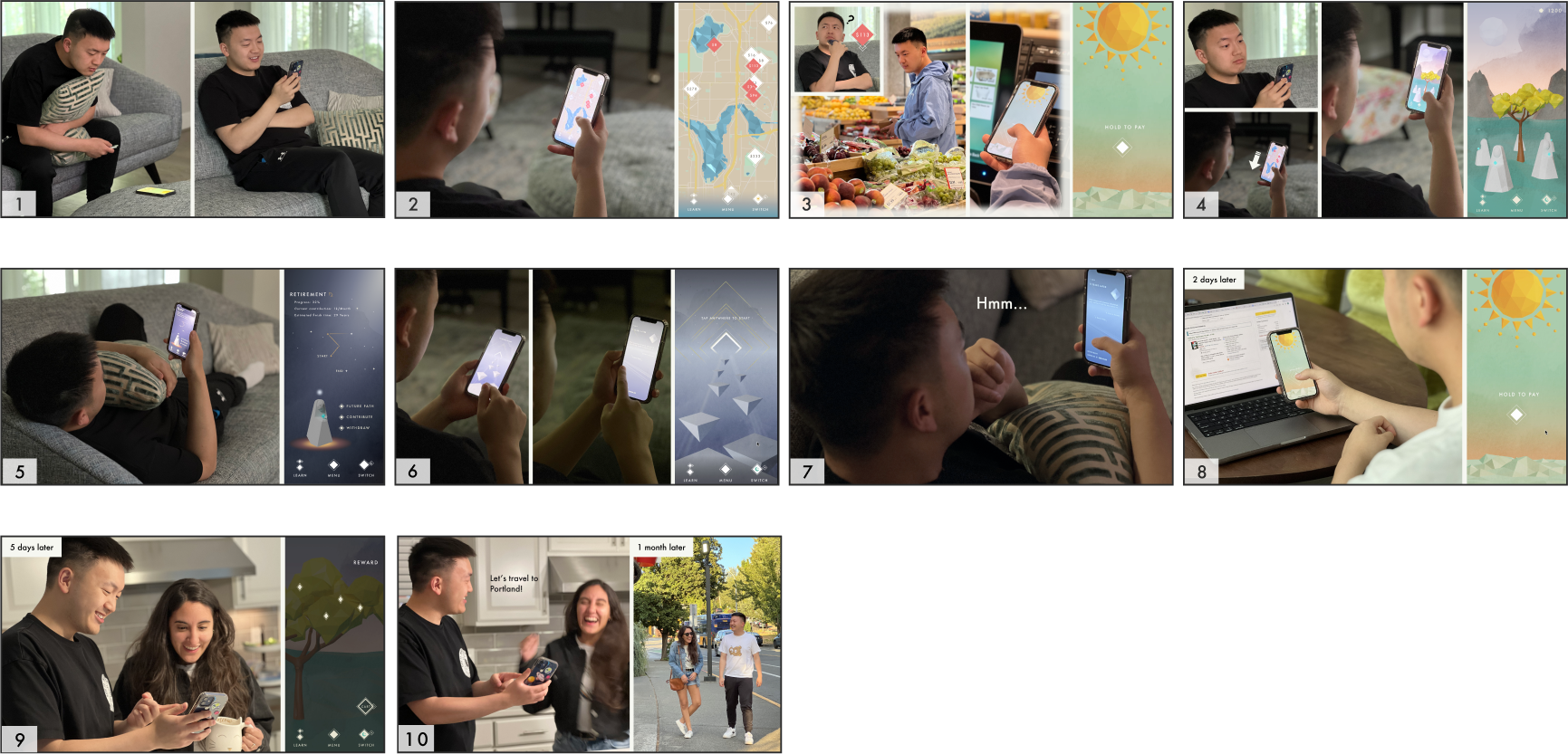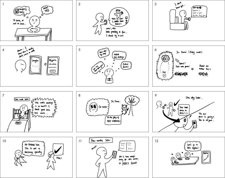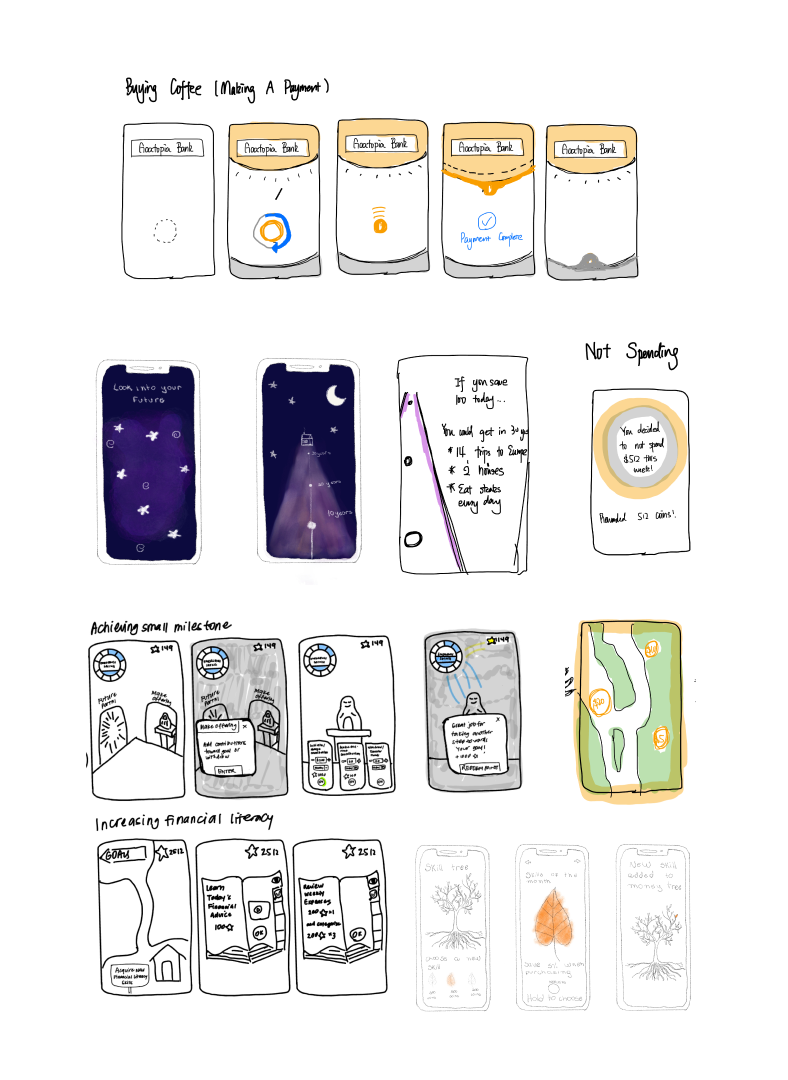 During the initial storyboard process, our team embarked on a mission to ensure everyone had a shared understanding of the product and its vital functionalities. This phase was characterized by our enthusiasm for creating an engaging, gamified experience, temporarily setting aside the financial aspects to prioritize the fun factor.