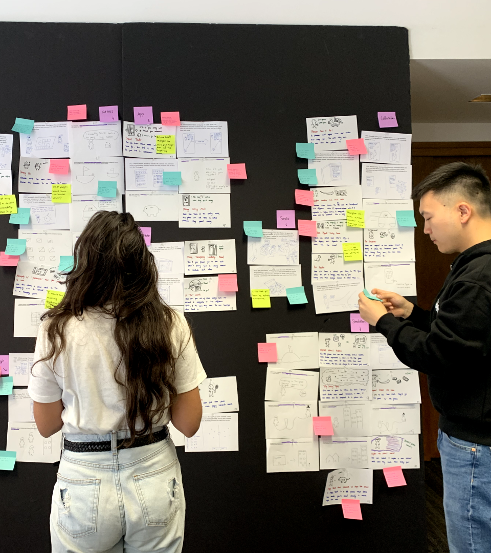 During the ideation phase, we followed a meticulous process to narrow down our ideas and identify the most promising directions. Initially, we applied key design principles and desired outcomes as our guiding criteria. We then employed dot-voting to gauge the collective enthusiasm for each concept. Subsequently, we scrutinized the ideas through the lens of our research findings, eliminating those that didn't align with our insights.
